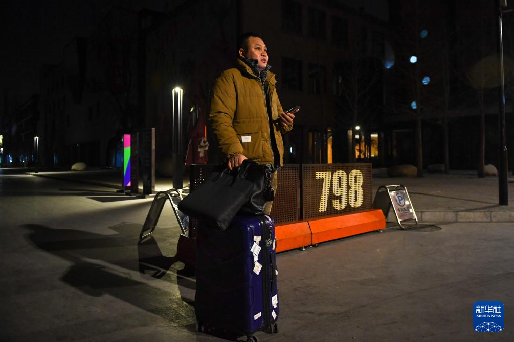 2月6日凌晨5时许,在北京开餐厅的张红径在798艺术区等候前往机场的出租车。