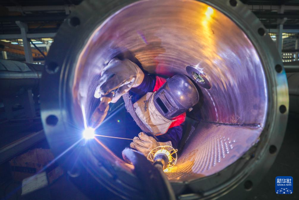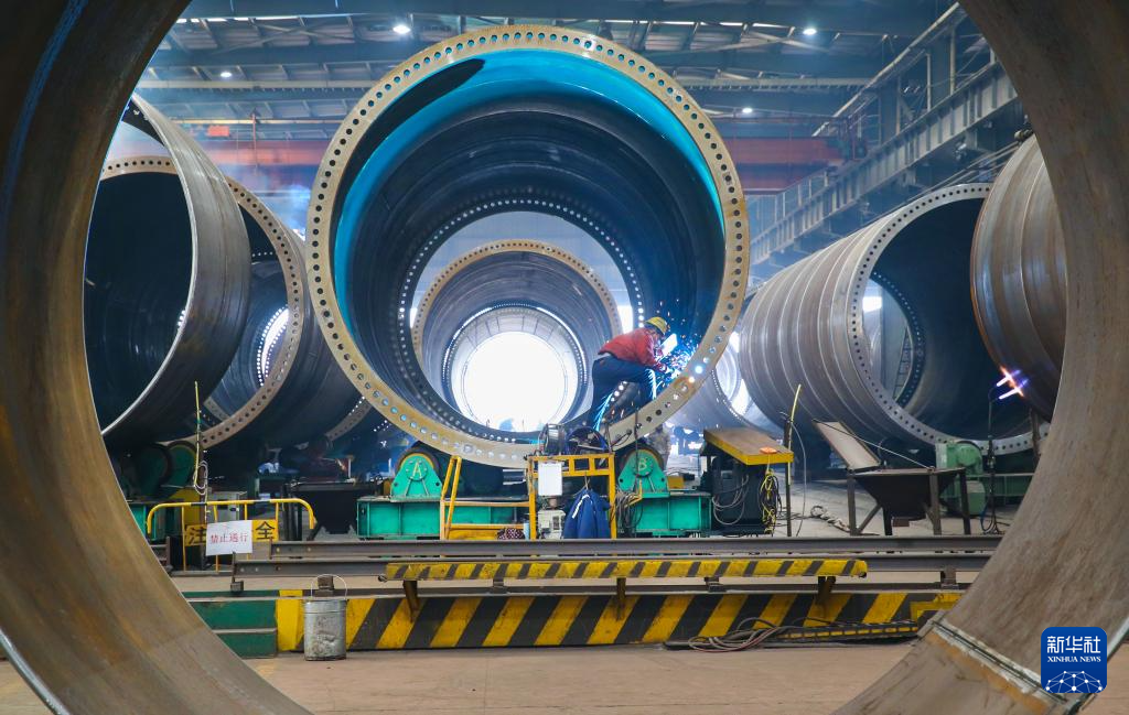 2月18日,江苏连云港经济技术开发区一家风电设备公司车间内,工人在生产风电塔架。