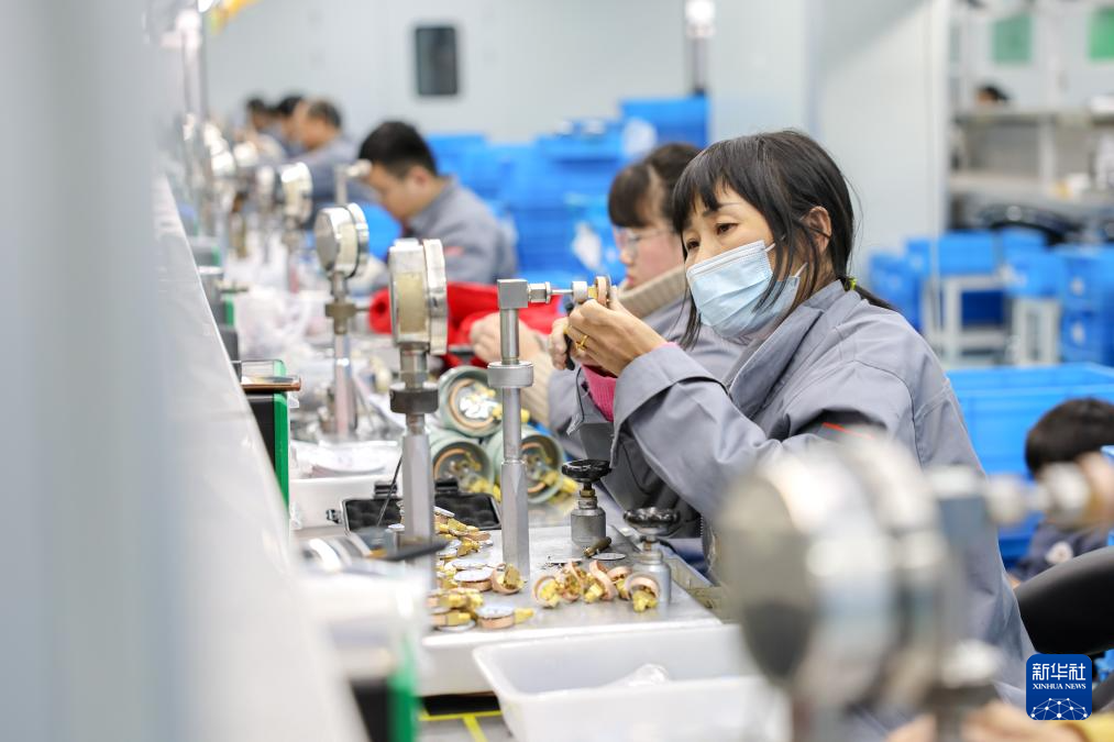 2月18日,在浙江长兴一家仪表企业,工人们在生产流水线上忙碌作业。