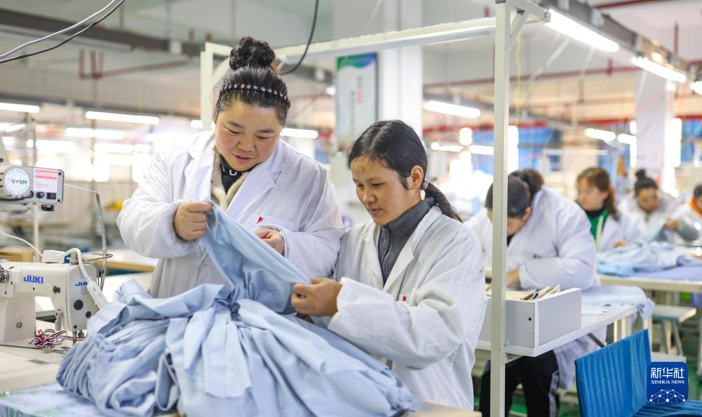 2月18日,贵州省铜仁市玉屏侗族自治县一家服装生产企业,工人加工出口订单服装。