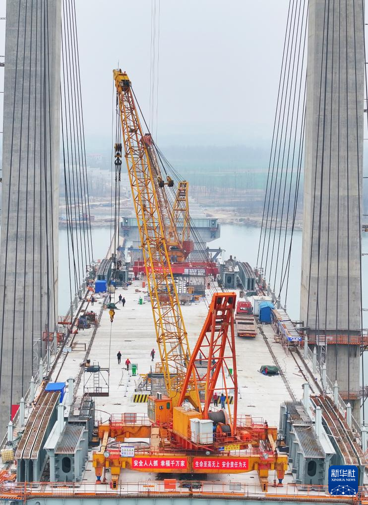 2月18日,在湖北襄阳牛首汉江特大桥施工现场,施工人员进行吊装作业。