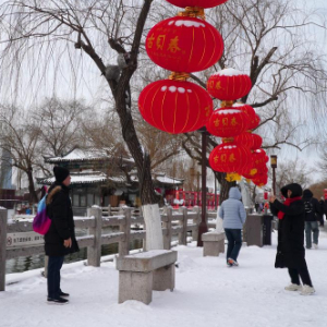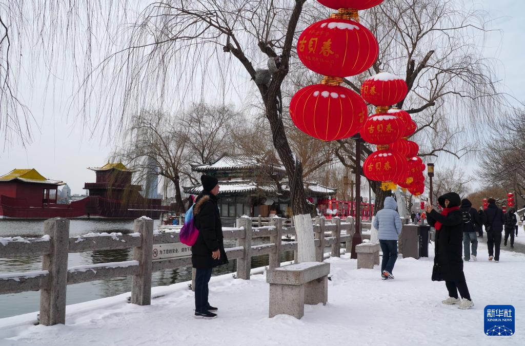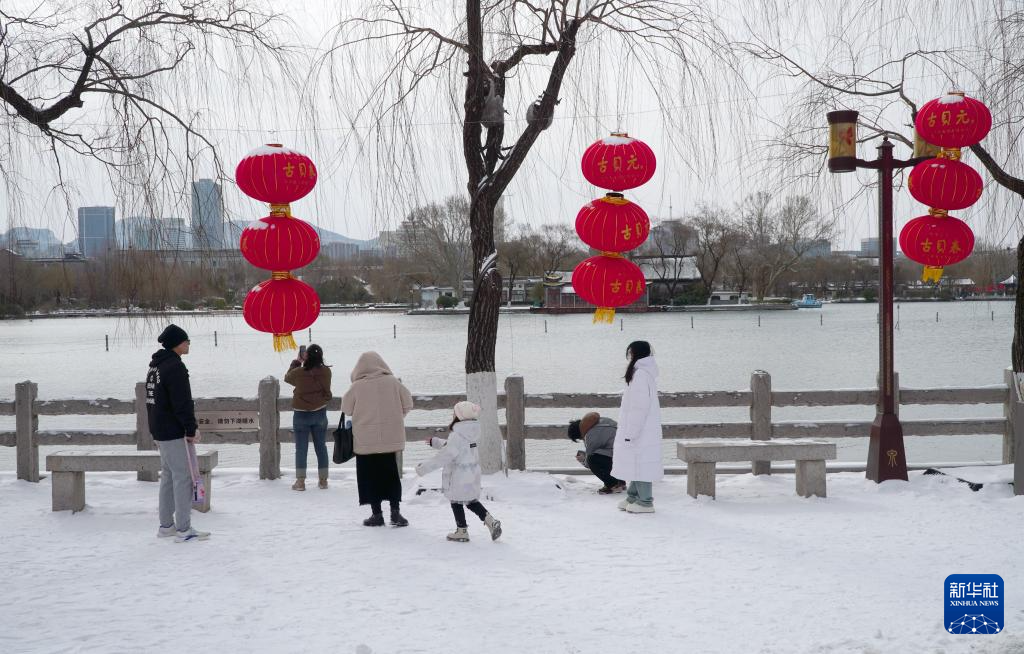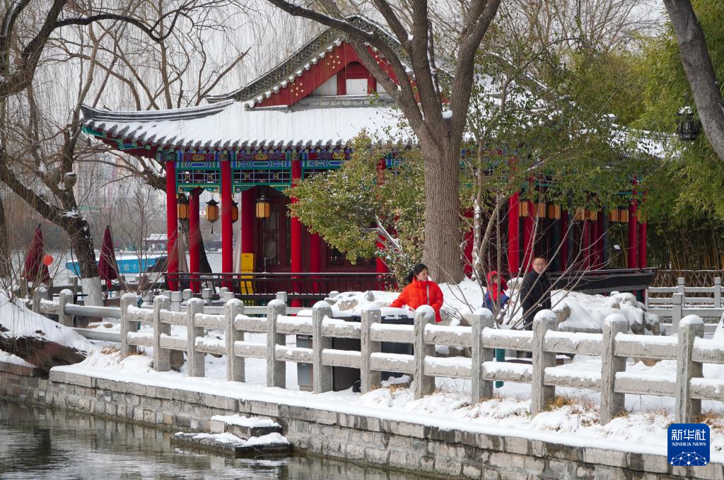当日,山东省济南市停止降雪,雪后大明湖银装素裹,碧波荡漾,吸引不少市民和游客前来游览。