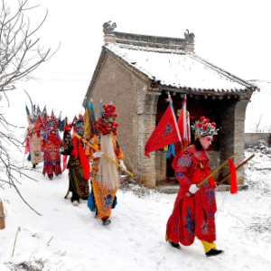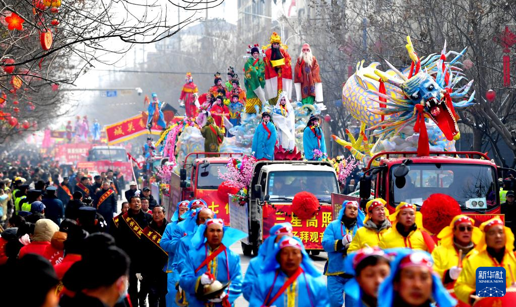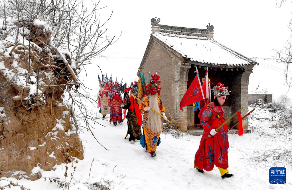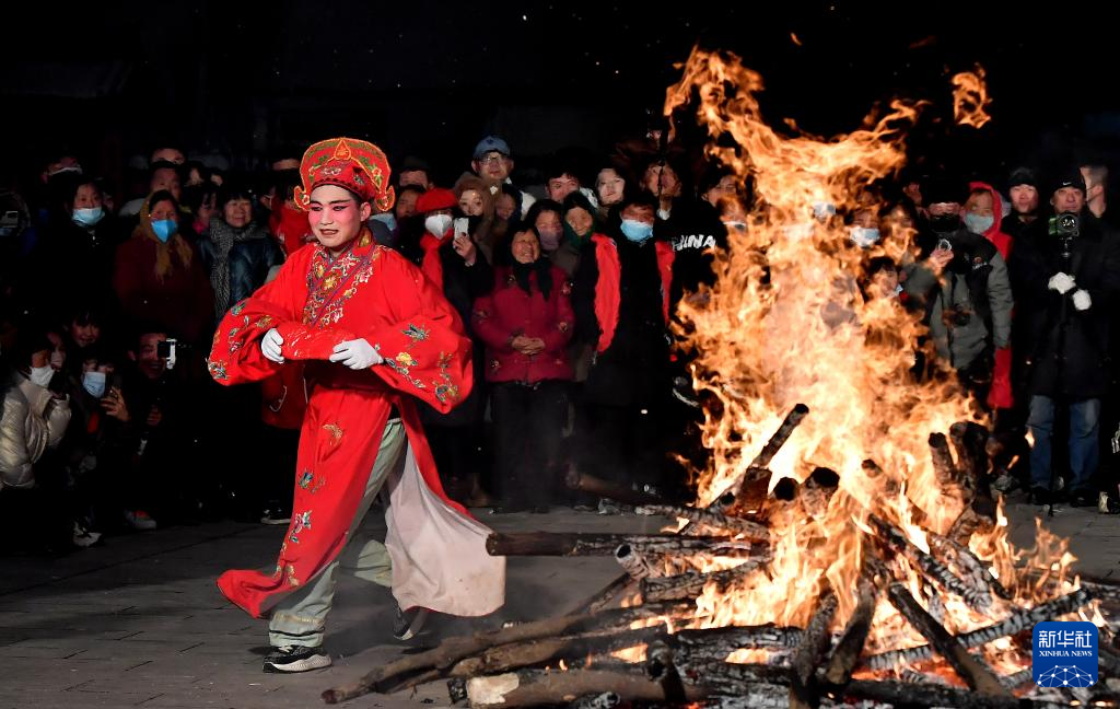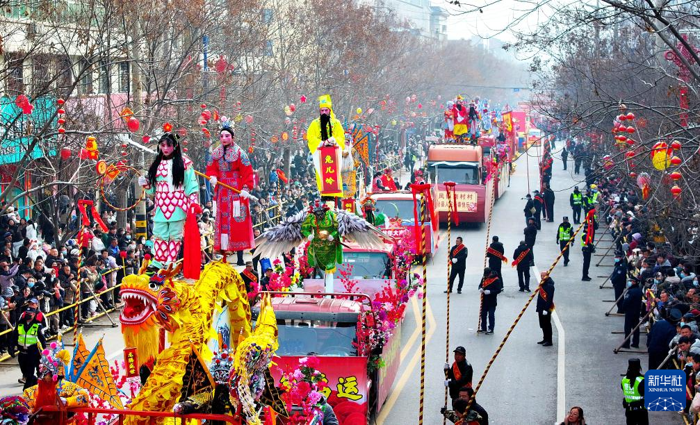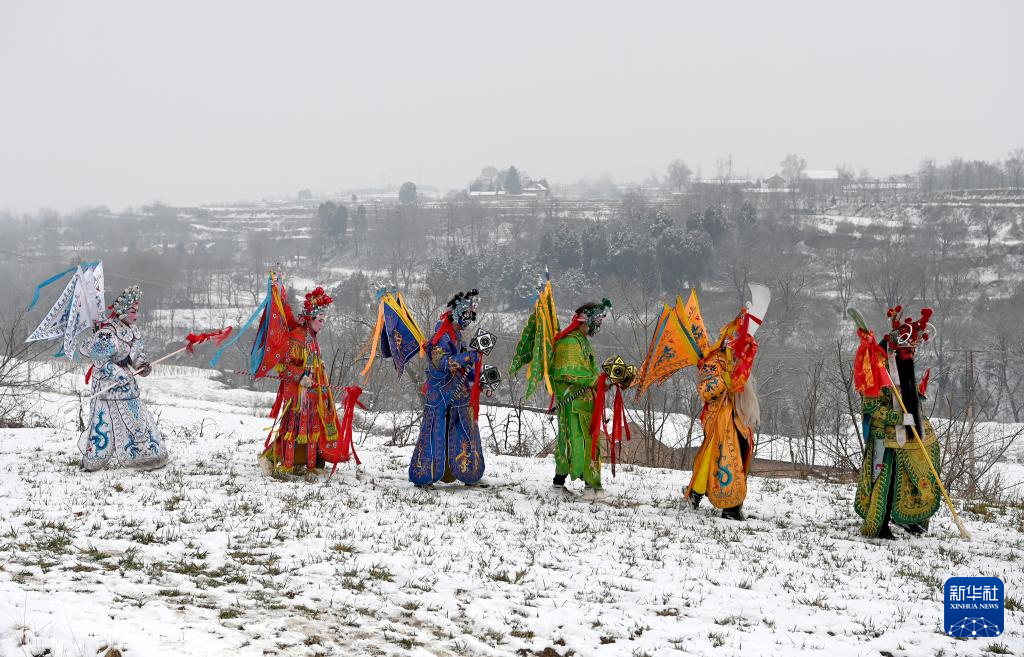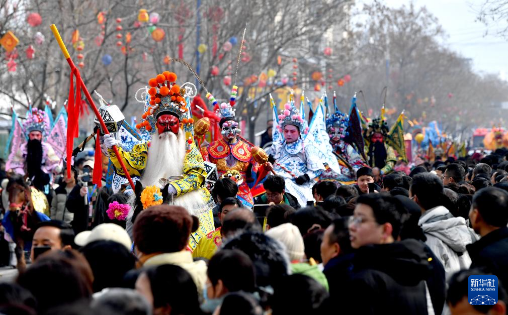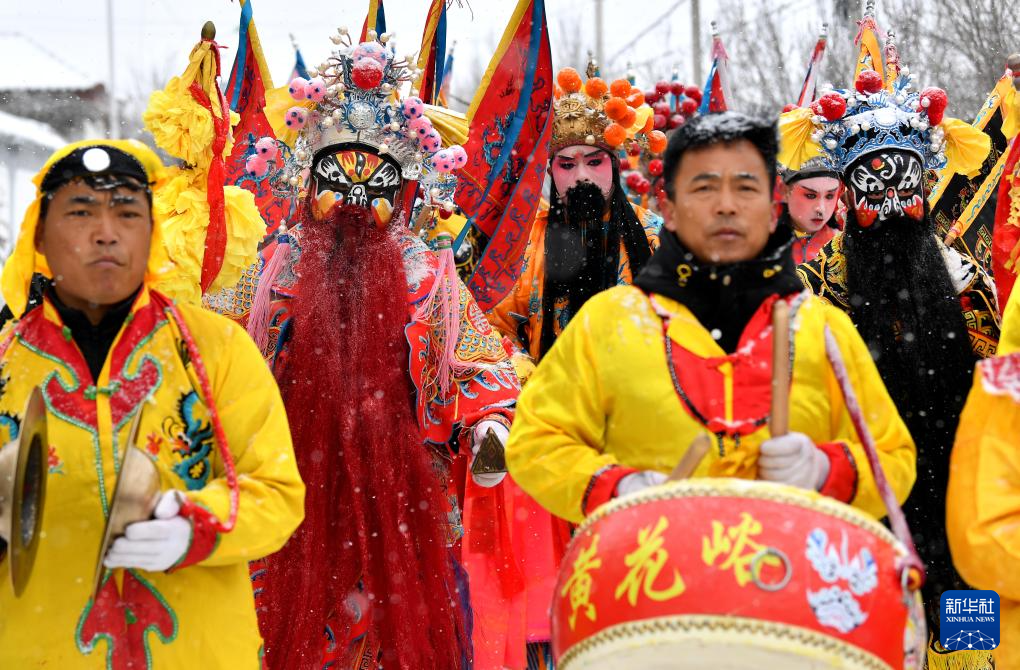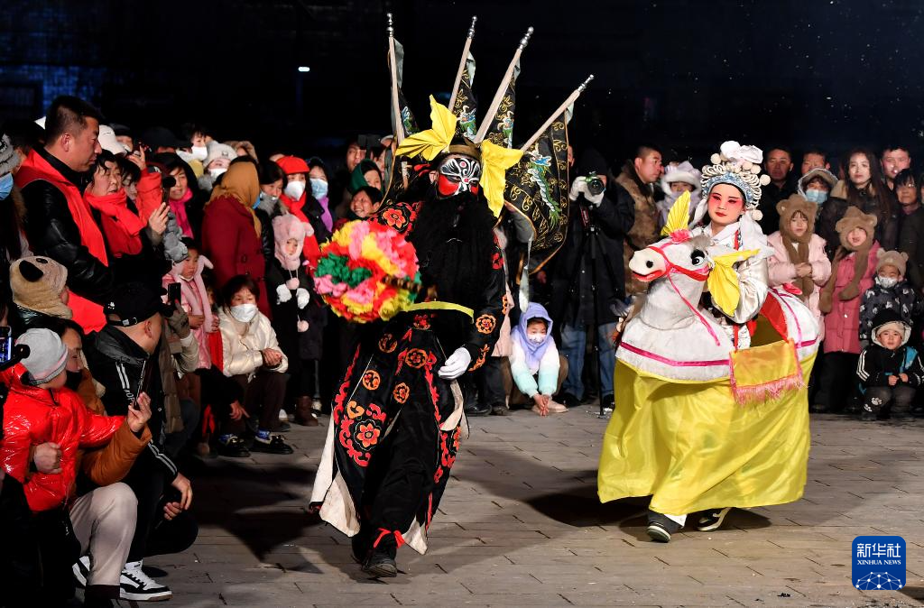 2月23日,陕西省宝鸡市陇县东南镇黄花峪村在进行社火游演。