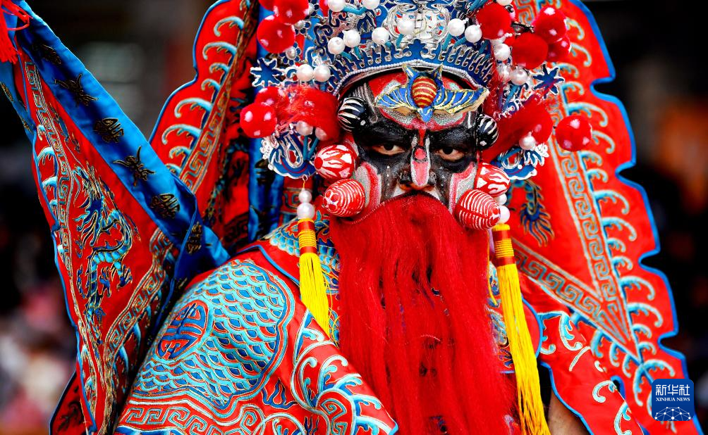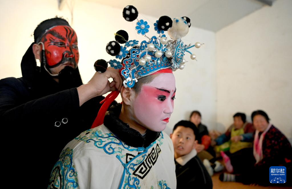 2月23日,陕西省宝鸡市陇县东南镇黄花峪村村民在准备进行社火表演。