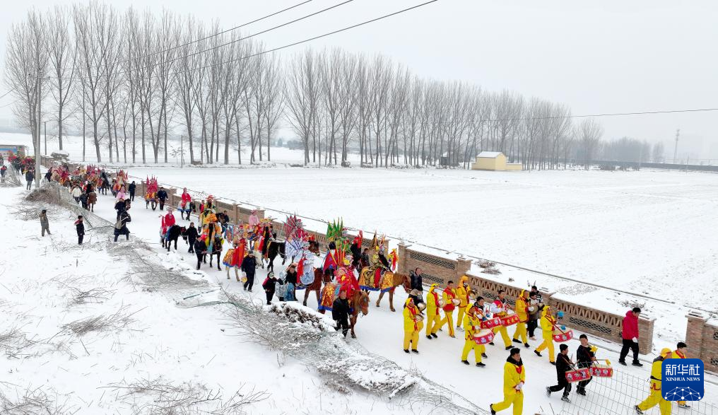 2月23日,陕西省宝鸡市陇县东南镇黄花峪村在进行马社火游演(无人机照片)。