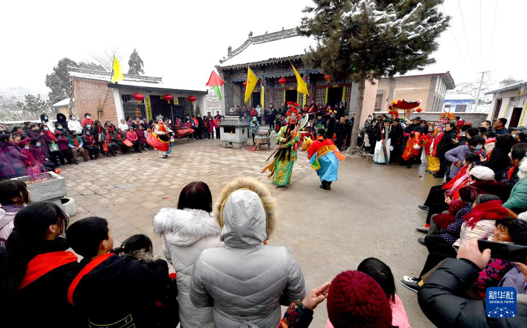 2月23日,陕西省宝鸡市陇县东南镇黄花峪村在进行地台社火表演。