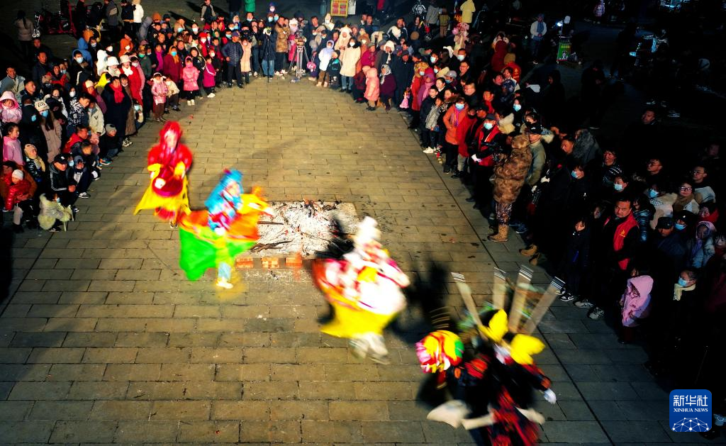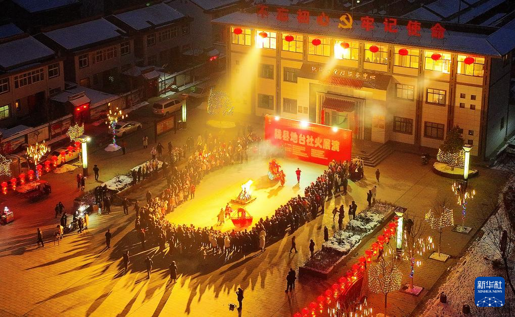 2月23日,陕西省宝鸡市陇县东南镇纸沟村在进行地台社火表演(无人机照片)。