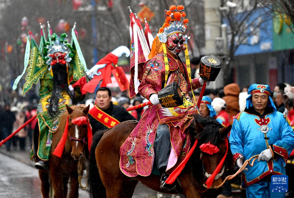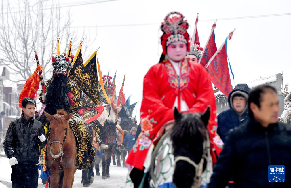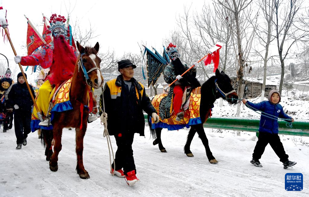 2月23日,陕西省宝鸡市陇县东南镇黄花峪村在进行马社火游演。
