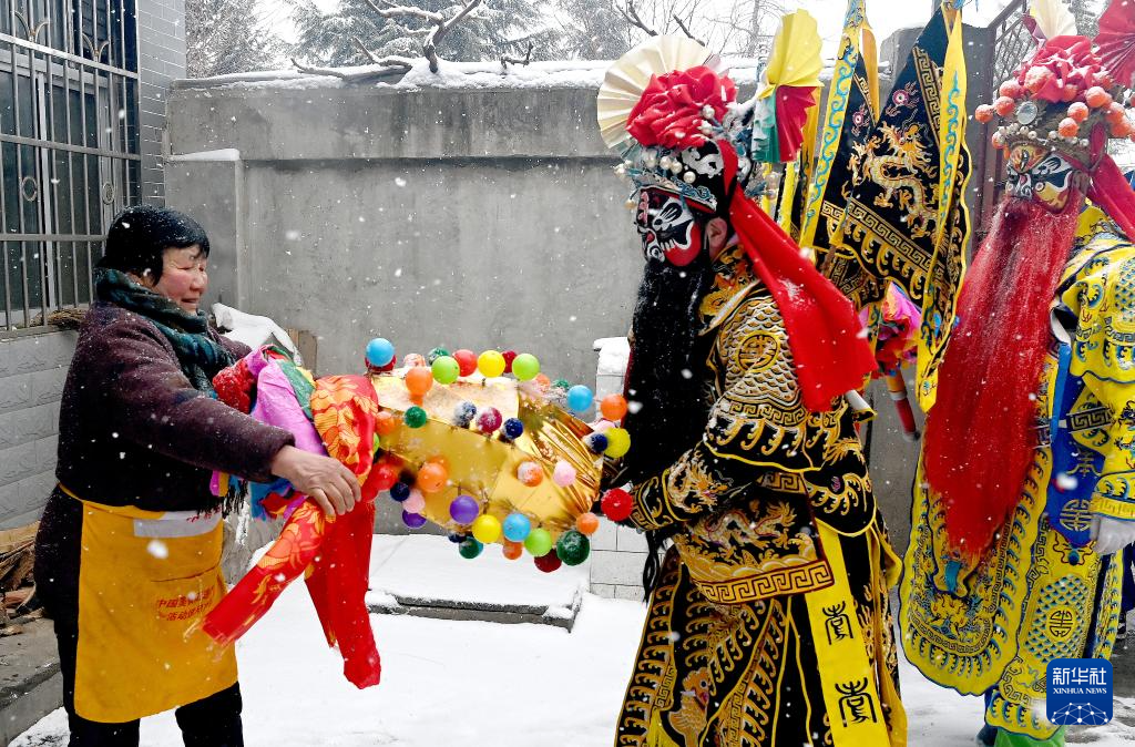 2月23日,陕西省宝鸡市陇县东南镇黄花峪村村民为入户游演的社火队披红。