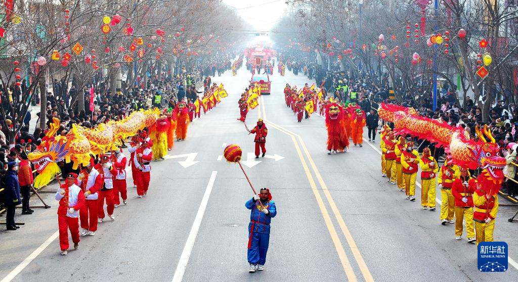 2月24日,陕西省宝鸡市陇县元宵节社火巡游(无人机照片)。