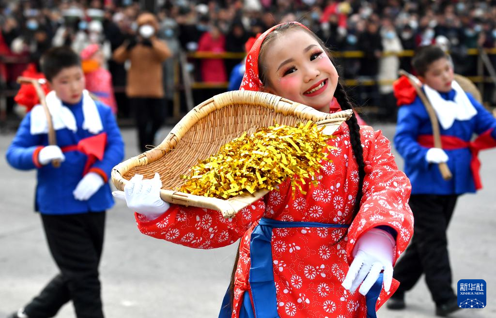 2月24日,陕西省宝鸡市陇县元宵节社火巡游活动上,少儿社火队员在扭秧歌。