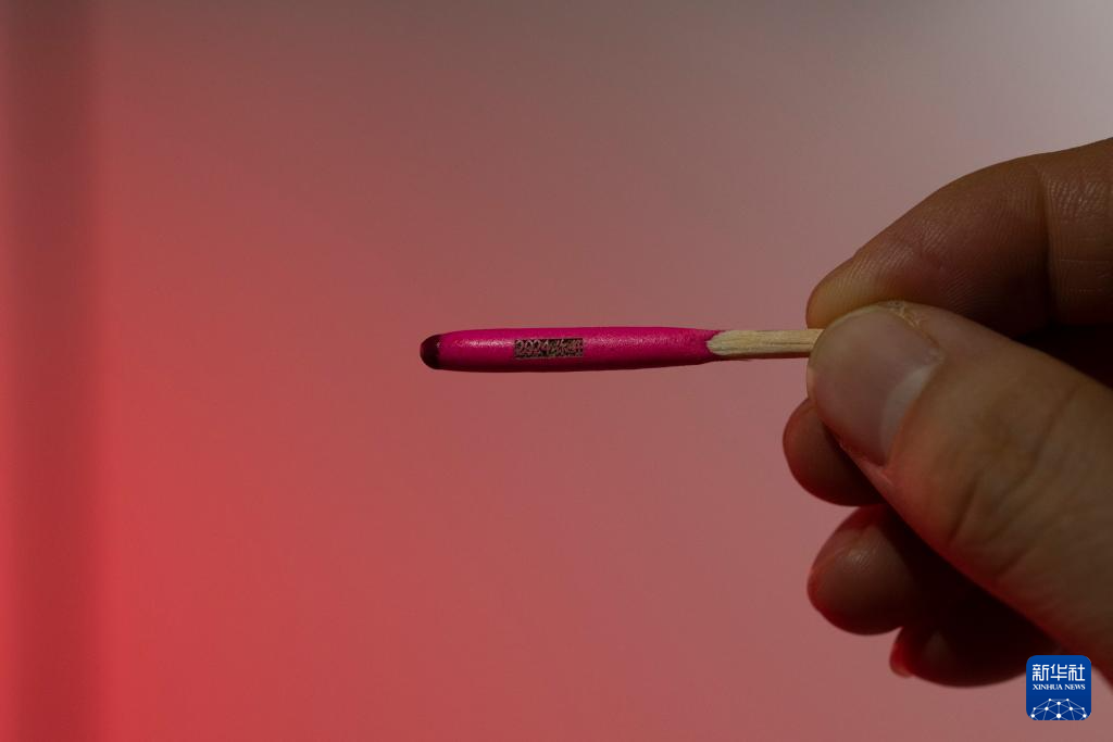 1月19日,在位于西安的中科微精总部车间,工作人员展示用超快激光微加工技术在火柴头上刻的字:2024你好。