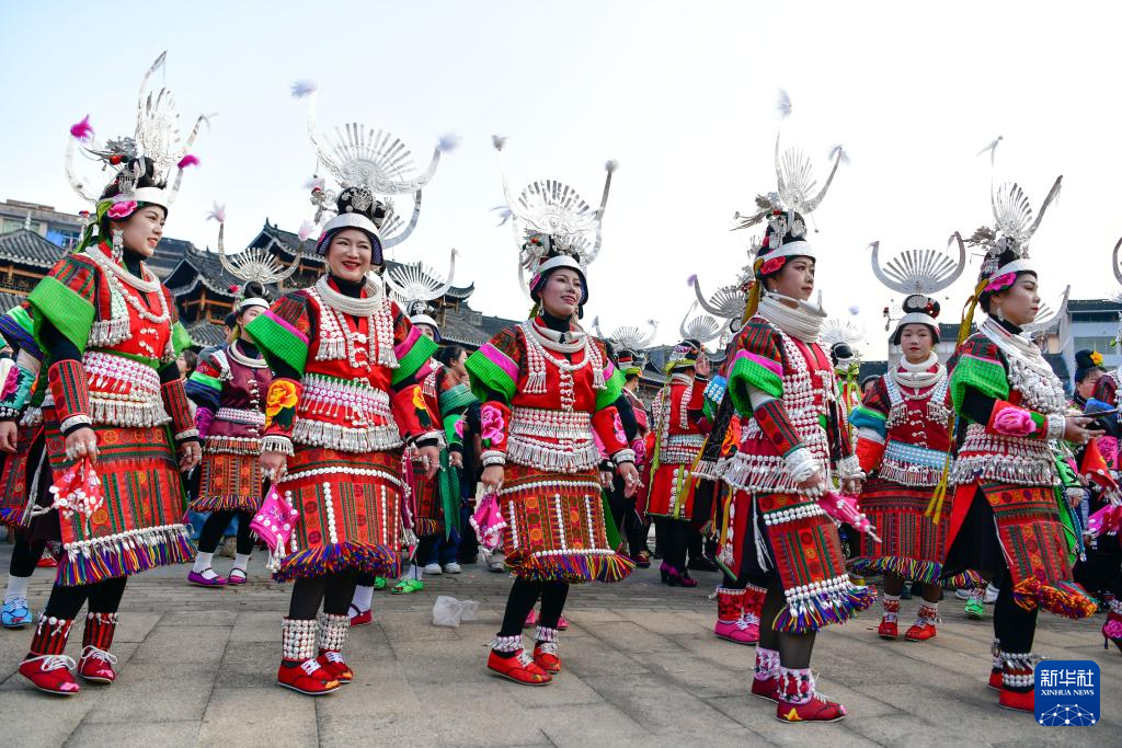 3月2日,在贵州省凯里市舟溪镇,苗族姑娘身着盛装跳起芦笙舞。