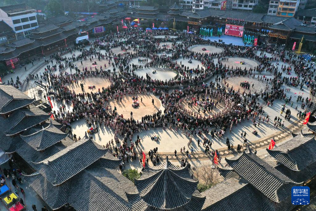 3月2日,在贵州省凯里市舟溪镇,苗族群众参加“甘囊香”芦笙节活动(无人机照片)。