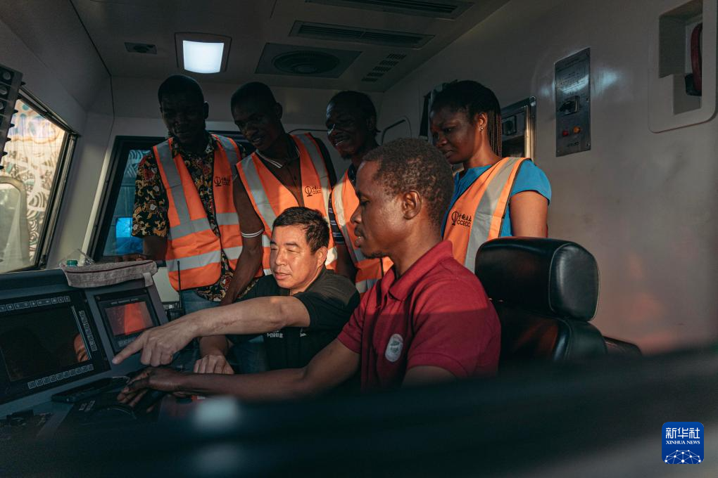 3月2日,在尼日利亚拉各斯的拉伊铁路莫博拉吉·约翰逊火车站,中方指导司机魏汝军与当地司机塞拉·阿比亚拉在驾驶室调整车辆,准备发车前往伊巴丹。