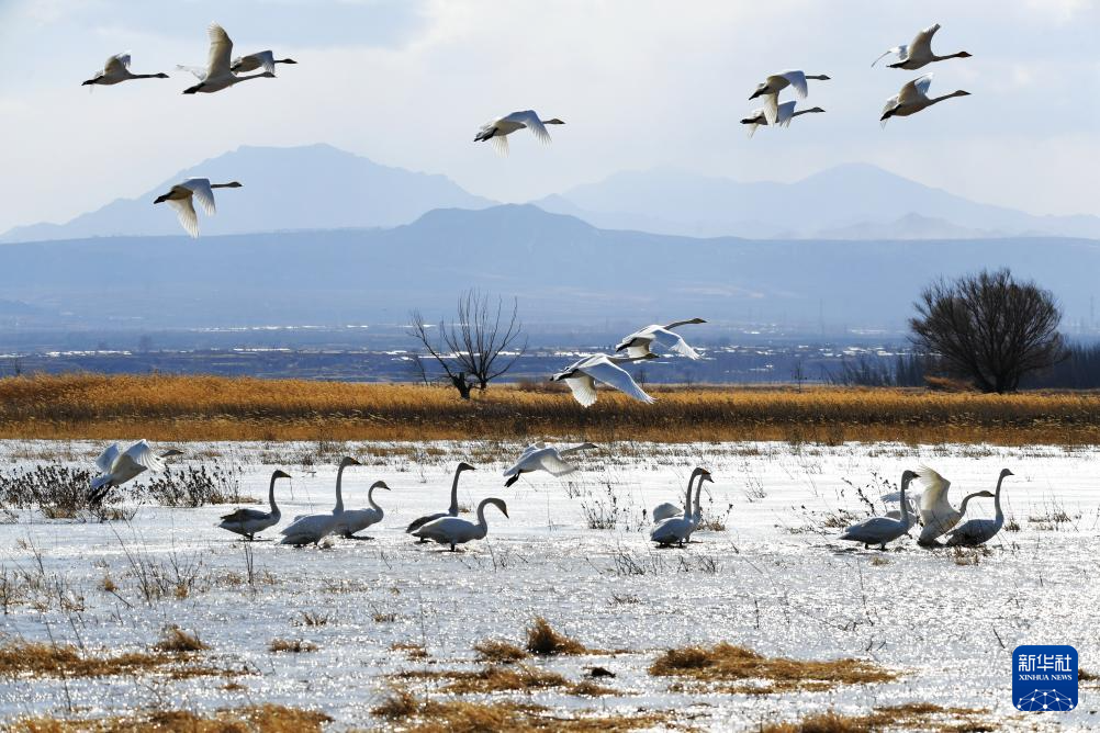 3月7日,在河北怀来官厅水库国家湿地公园,天鹅在空中飞舞。
