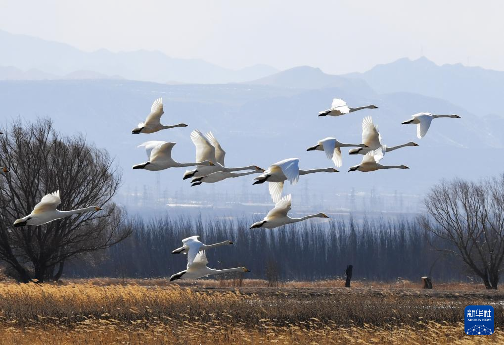 3月7日,在河北怀来官厅水库国家湿地公园,鸟儿在空中飞舞。