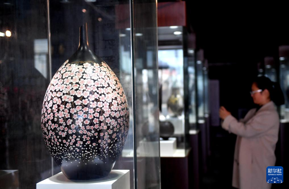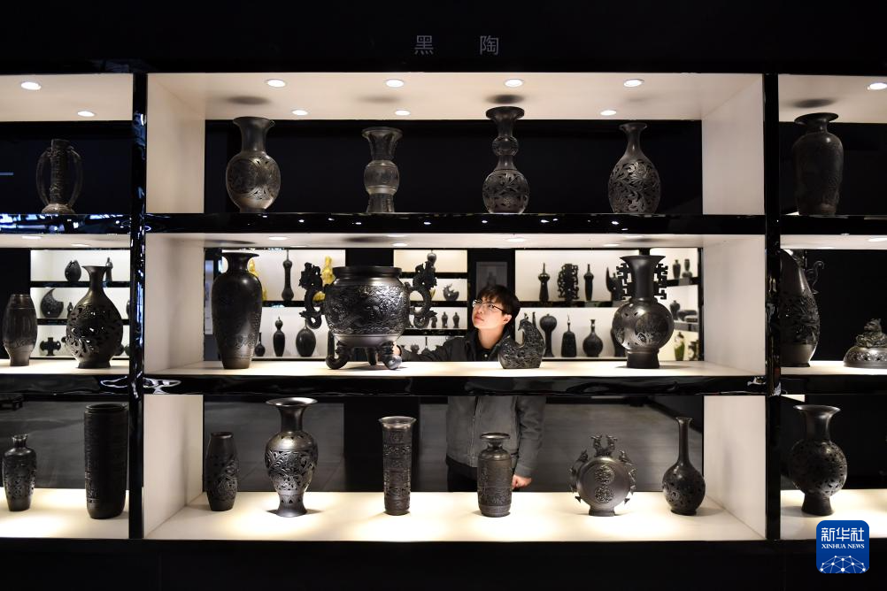 3月8日,在馆陶县一家陶艺漆艺艺术馆,参观者在欣赏黑陶产品。