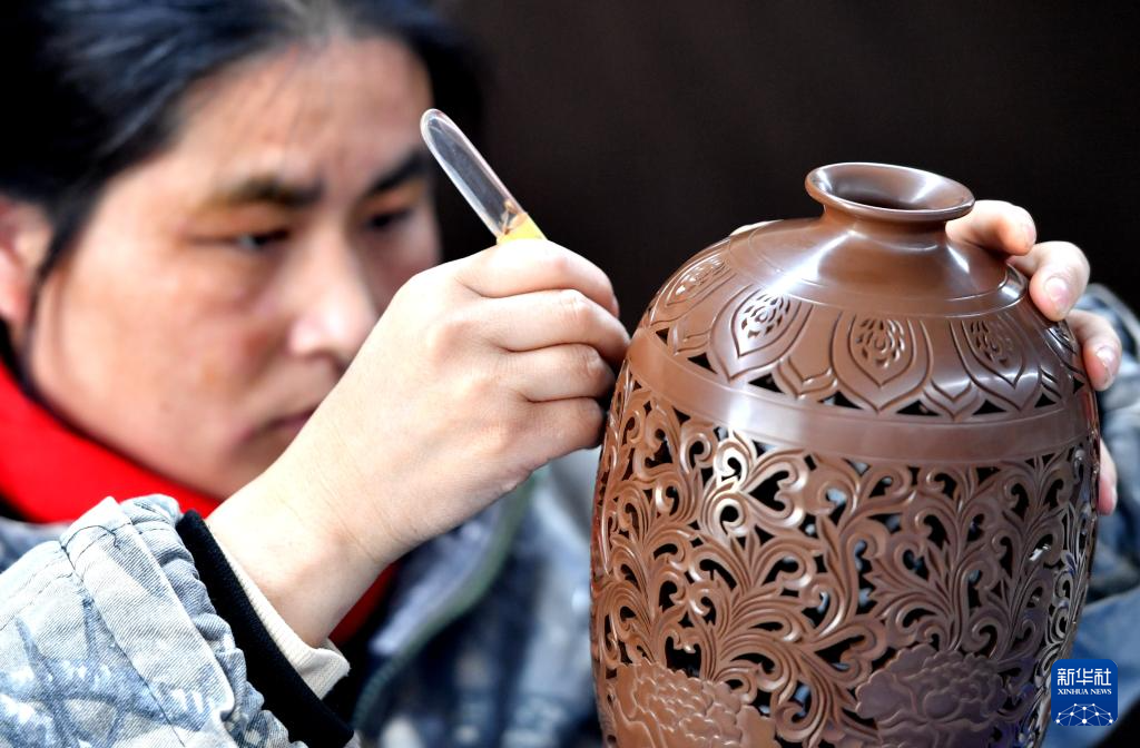 3月8日,馆陶县一家黑陶生产企业的工人在雕刻陶坯。