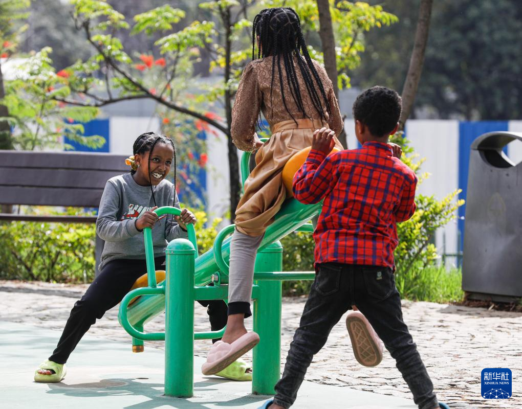 2月18日,在埃塞俄比亚首都亚的斯亚贝巴,小朋友在友谊广场玩跷跷板。