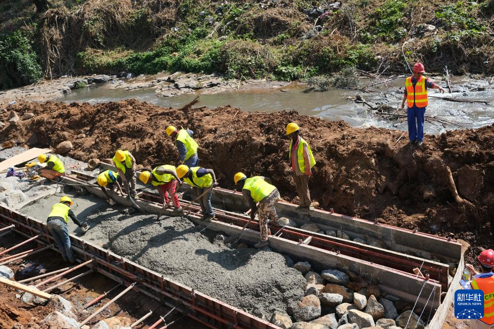 2019年10月27日,在埃塞俄比亚首都亚的斯亚贝巴,工人们在友谊广场河道施工现场工作。