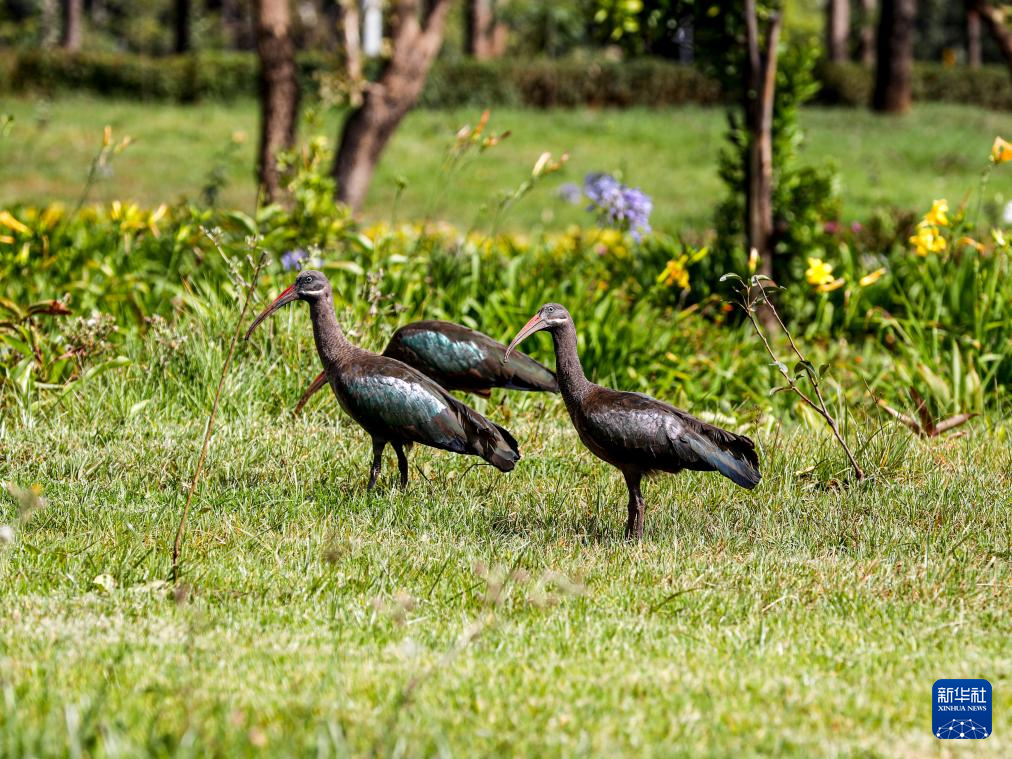 这是2月18日在埃塞俄比亚首都亚的斯亚贝巴友谊广场拍摄的凤头鹮。