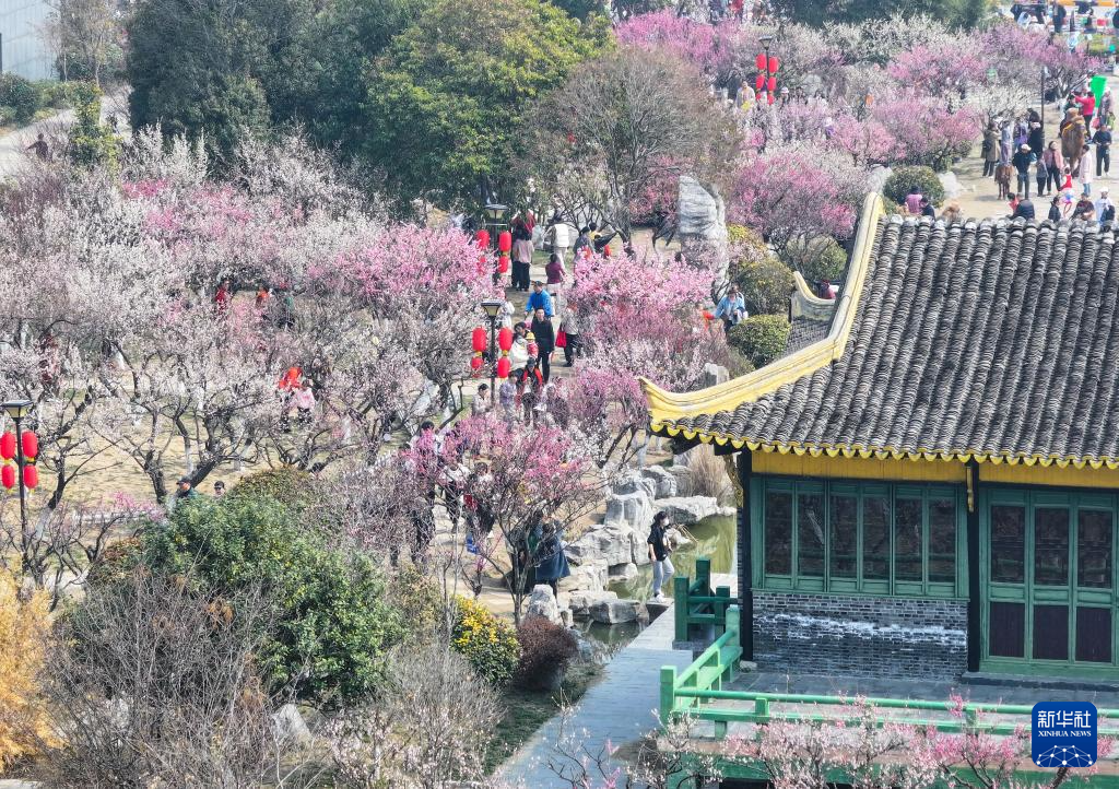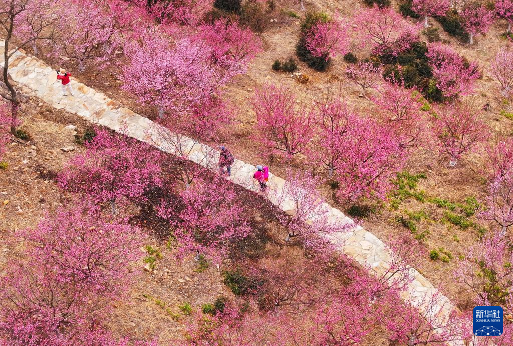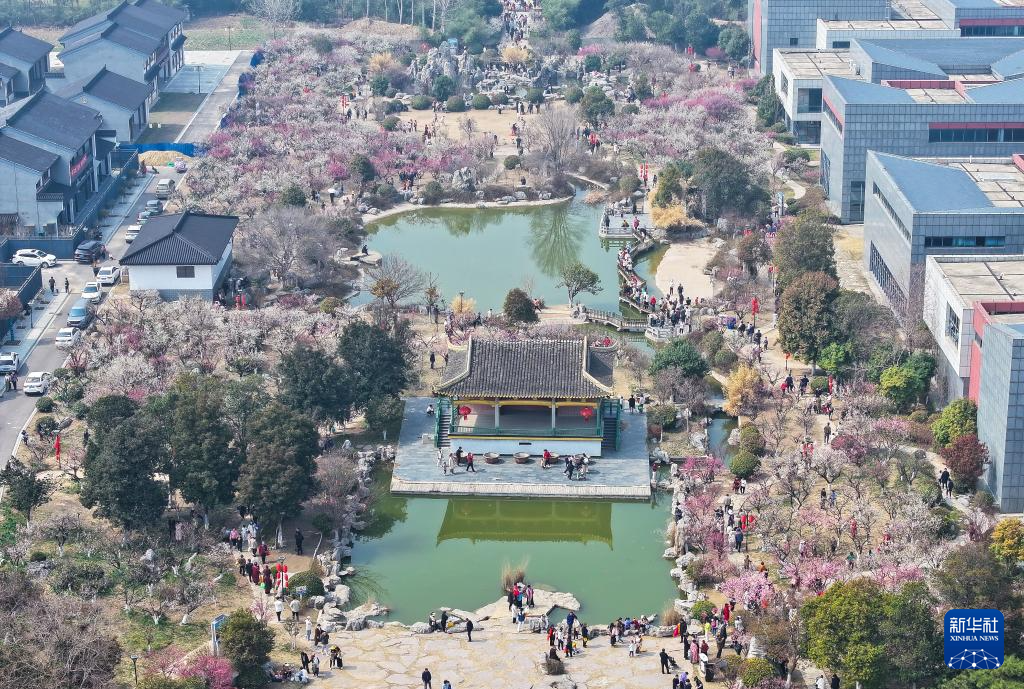 3月16日,游客在江苏省徐州市龟山探梅园赏梅(无人机照片)。