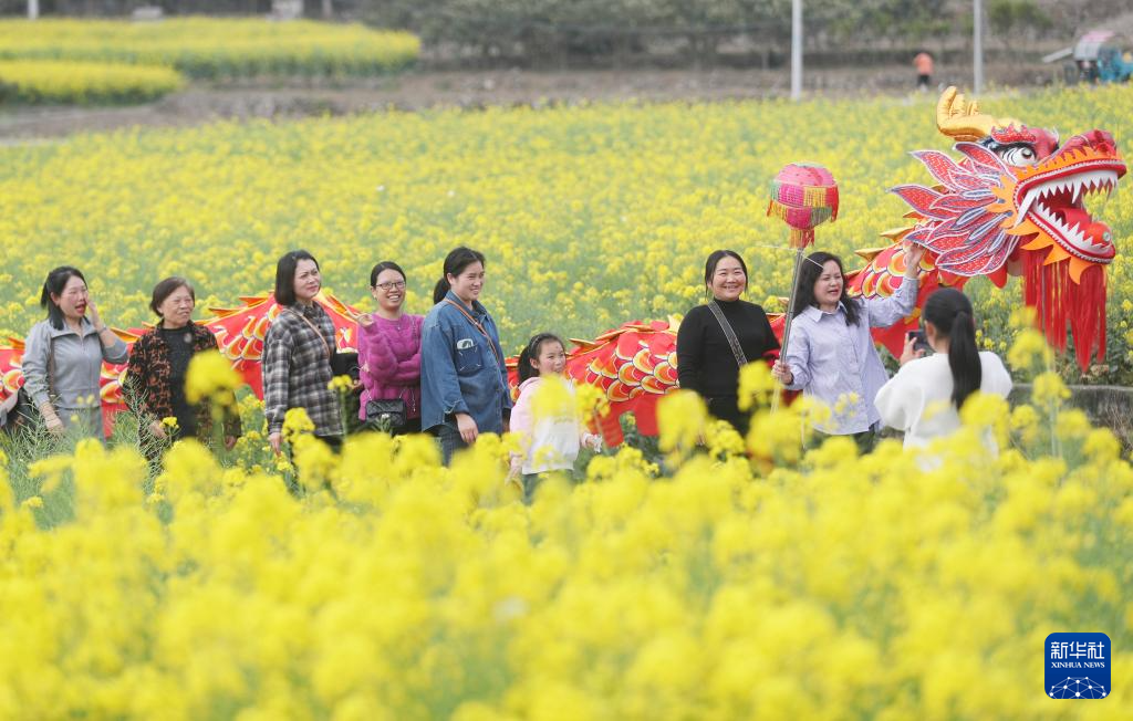 3月16日,人们在湖南省永州市双牌县泷泊镇枫木山村油菜花田赏花拍照。