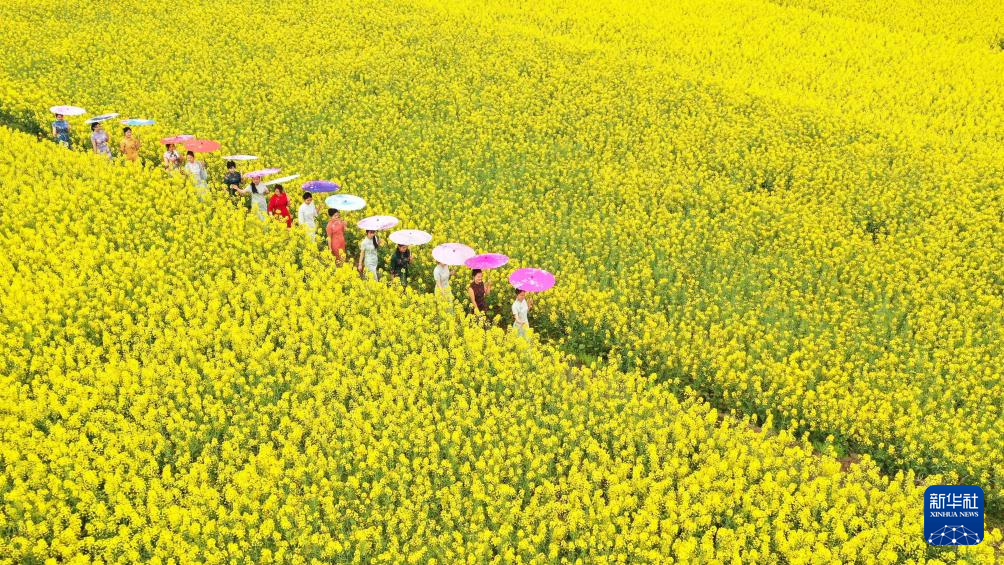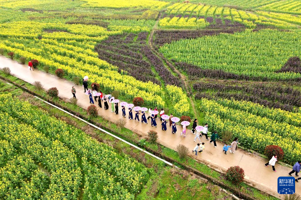 3月16日,在湖南省娄底市双峰县锁石镇,旗袍爱好者在油菜花田间走秀(无人机照片)。