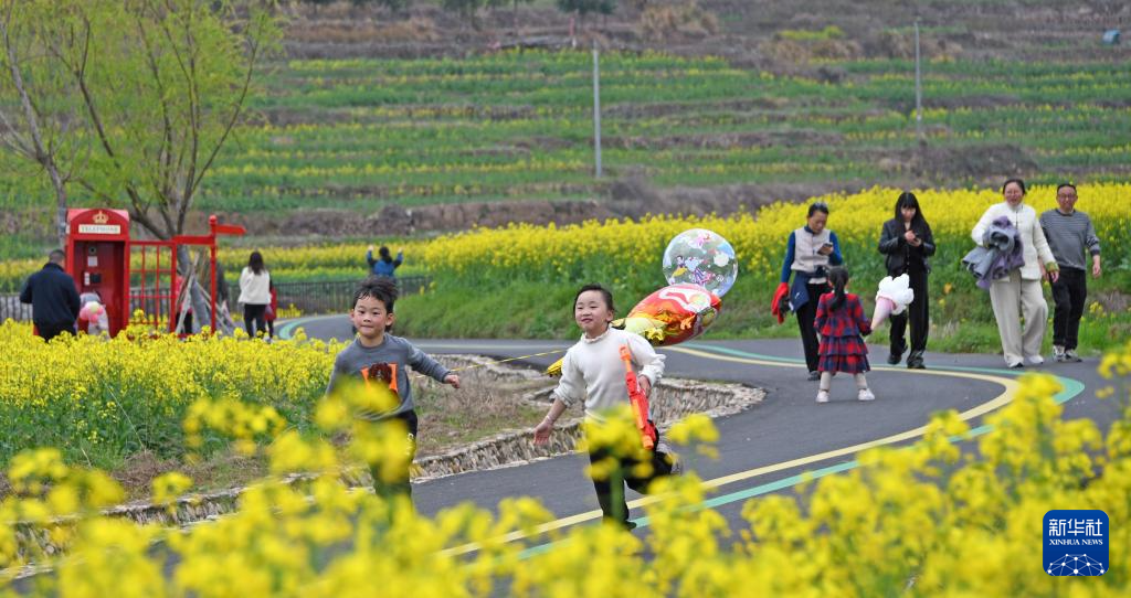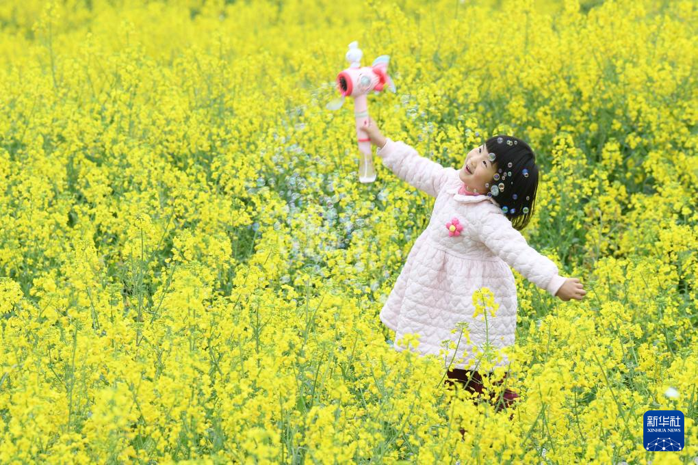 3月16日,在贵州省遵义市余庆县龙溪镇红军社区,一名小朋友在油菜花间玩耍。