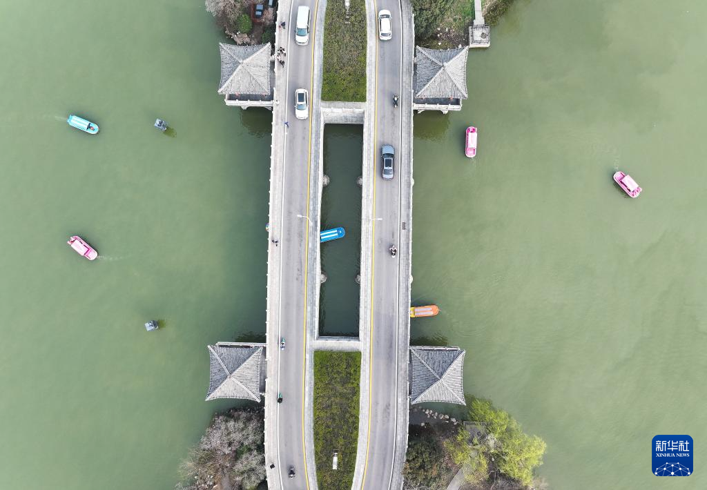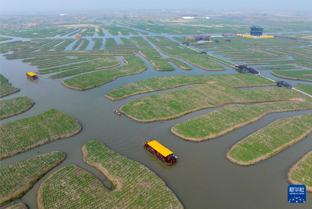 3月16日,游客在江苏省兴化市千垛景区乘船游览(无人机照片)。