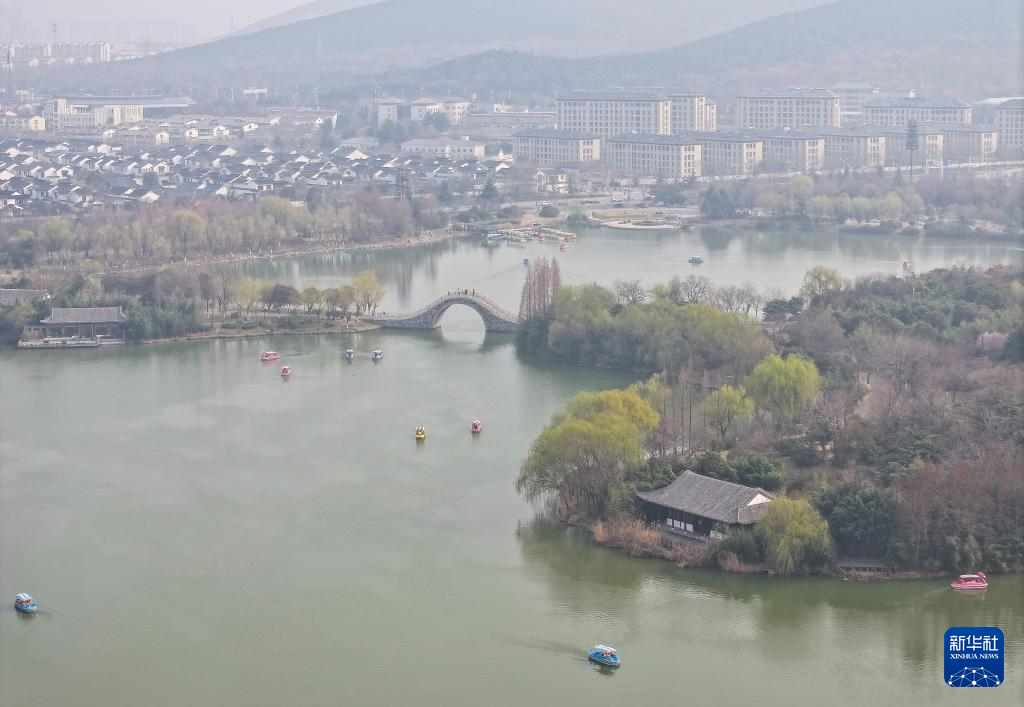 3月16日,游客在江苏省徐州市云龙湖旅游景区乘船游玩(无人机照片)。