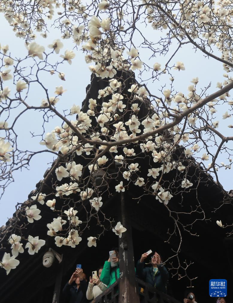 3月16日,游客在江苏省扬州市何园景区赏花拍照。