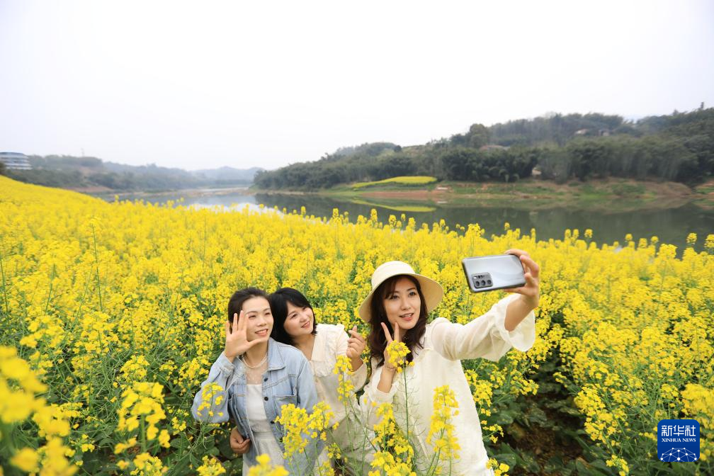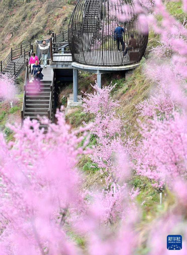 3月16日,游客在贵州省赤水市复兴镇长江村赏花拍照。