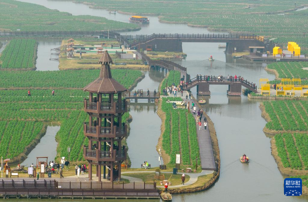 3月16日,游客在江苏省兴化市千垛景区游览(无人机照片)。