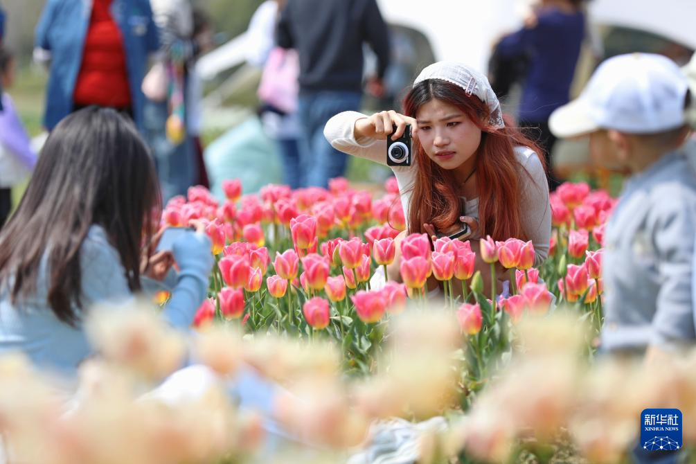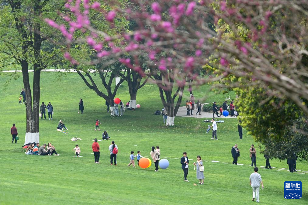 春日周末,人们来到户外,赏花游玩,享受春光。