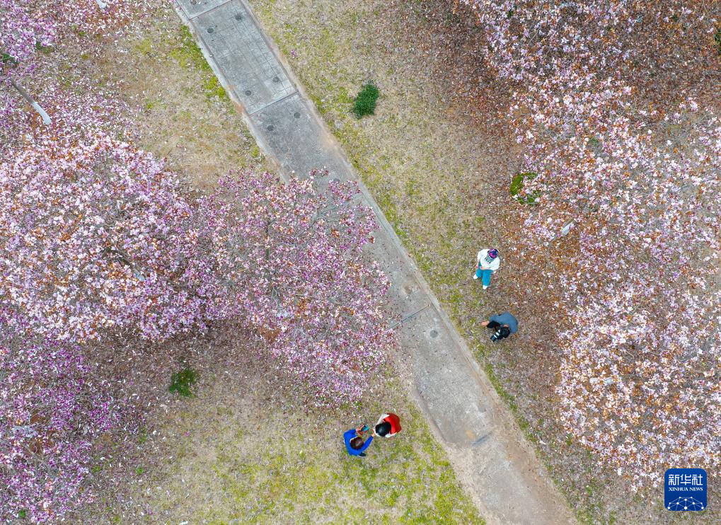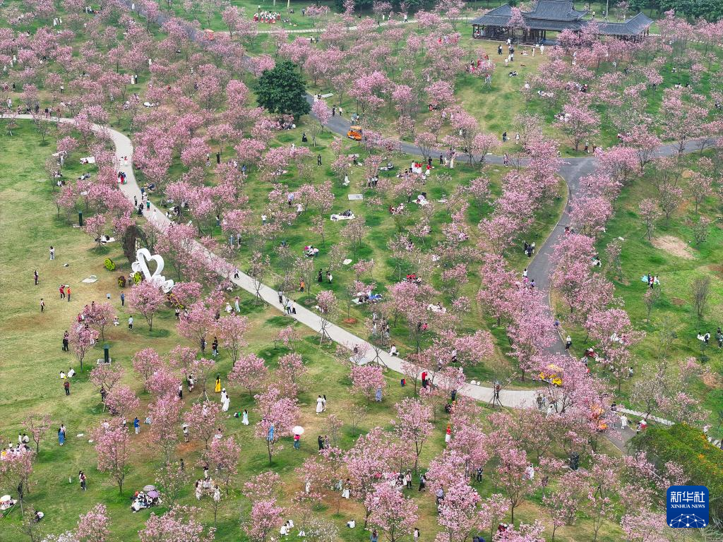 3月16日,游人在广西南宁市青秀山景区的樱花园赏花踏春(无人机照片)。