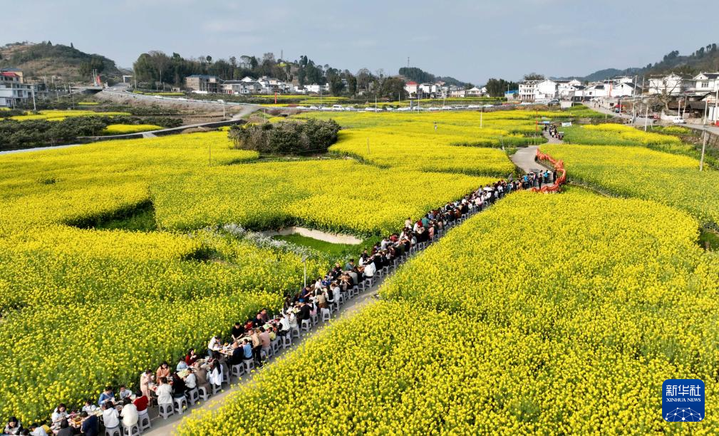 3月16日,游客在贵州省遵义市播州区一片油菜花田间体验长桌宴(无人机照片)。