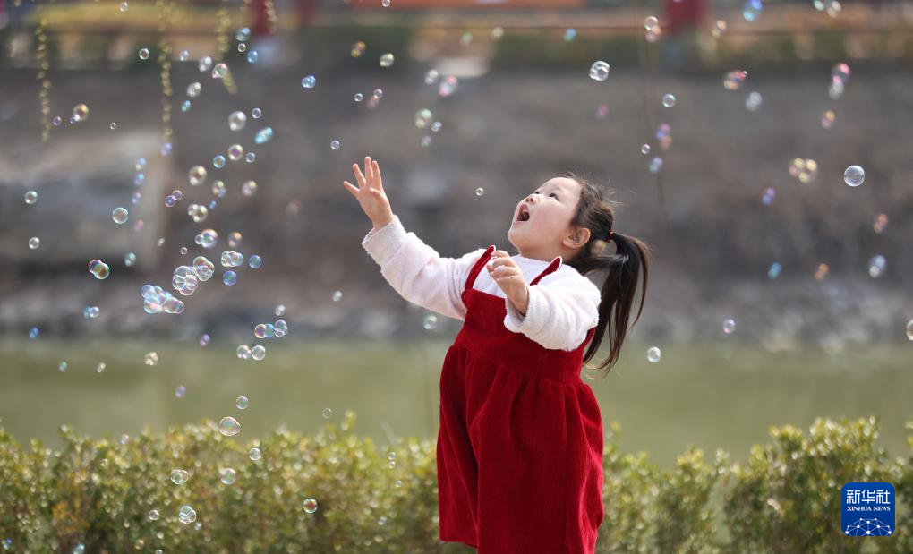 3月16日,在山东省临沂市郯城县郯城街道东南村,一名小女孩在玩泡泡。