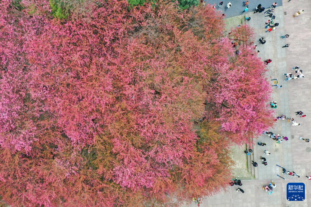 3月16日,市民在贵州省毕节市七星关区人民公园赏花游玩(无人机照片)。