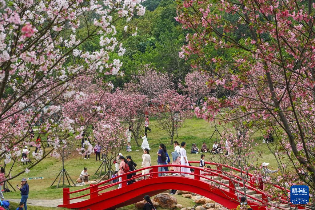 3月16日,游人在广西南宁市青秀山景区的樱花园赏花踏春。