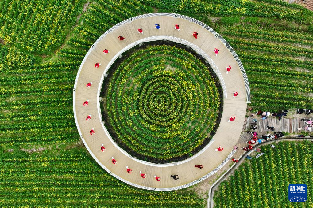 3月16日,在浙江省台州市仙居县双庙乡,人们在油菜花田游玩观光(无人机照片)。