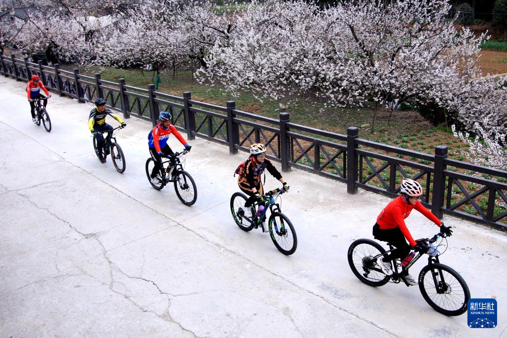 3月16日,骑行爱好者在湖北省十堰市郧阳区茶店镇大岭山村骑行。