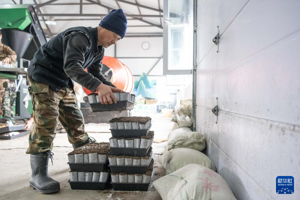 3月13日,在伊春森工集团林下经济种苗繁育基地,工作人员在车间内进行轻基质容器的生产作业。