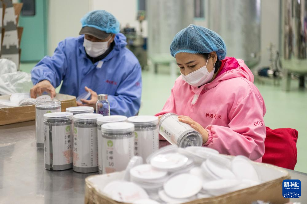 3月13日,在伊春市丰林县一家森林食品加工企业,工作人员在包装蓝莓相关产品。