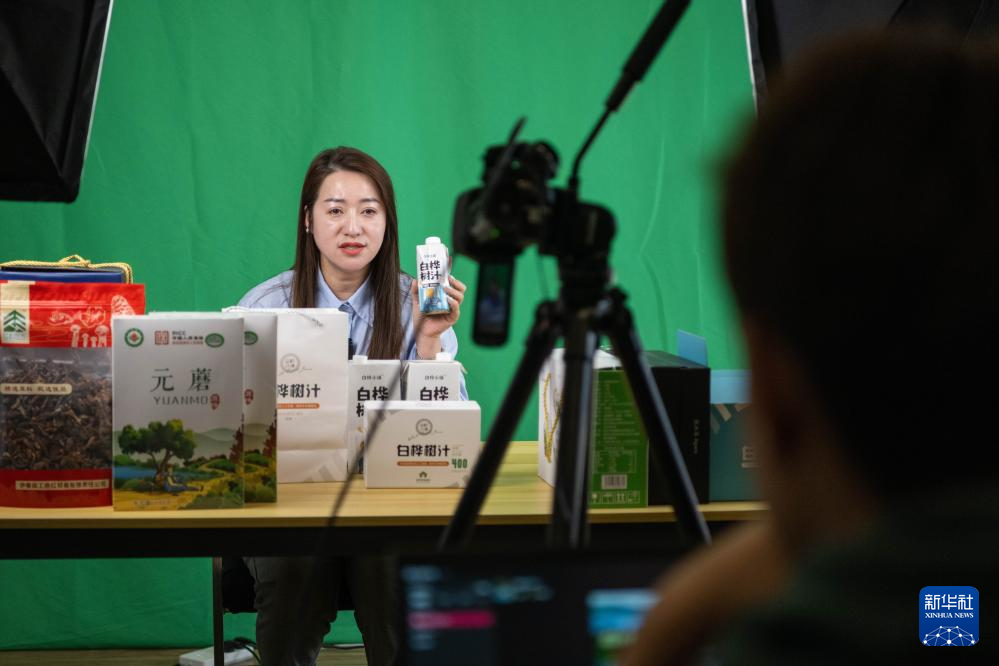 3月12日,在伊春森工电子商务产业园,一名电商主播在直播售卖当地林特产品。