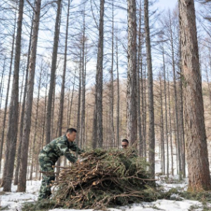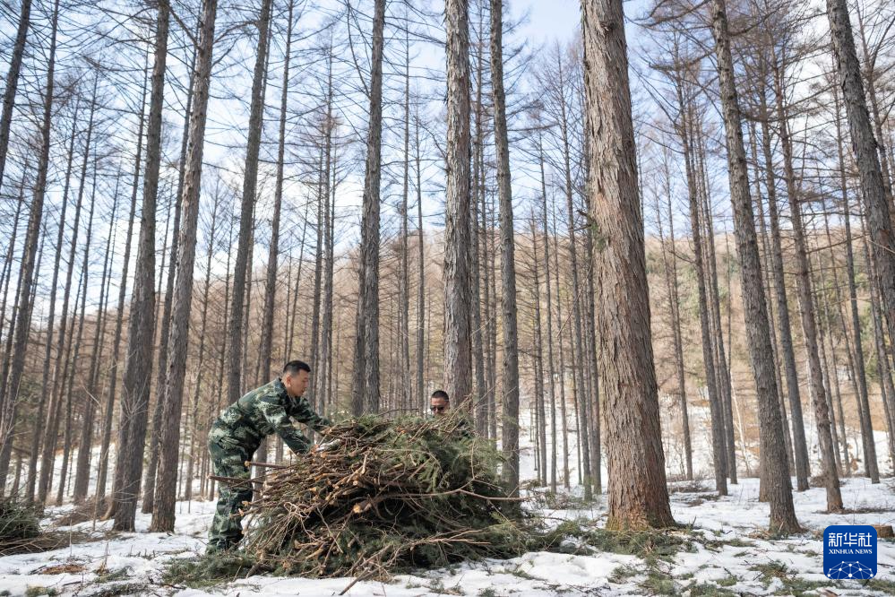 3月14日,在伊春森工集团美溪林业局公司一处森林可持续经营试点样地,工作人员在整理林下剩余物。
