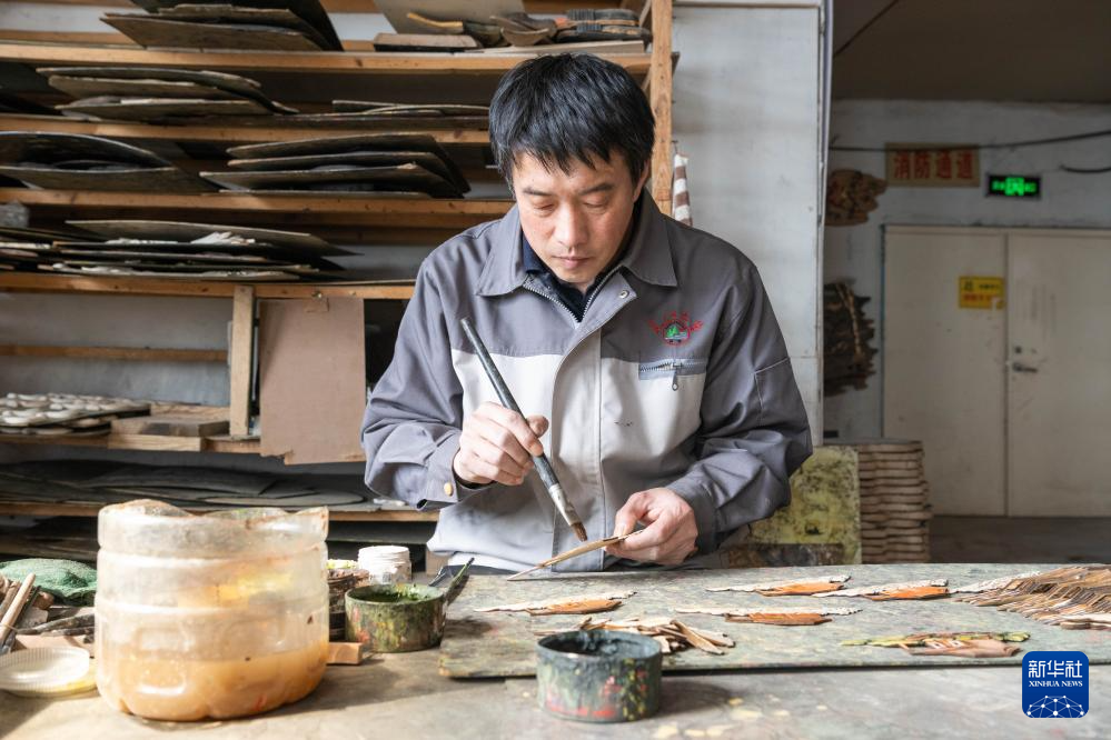 3月14日,在伊春市一家木艺公司的生产车间,工作人员对木拼画部件进行上色。