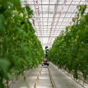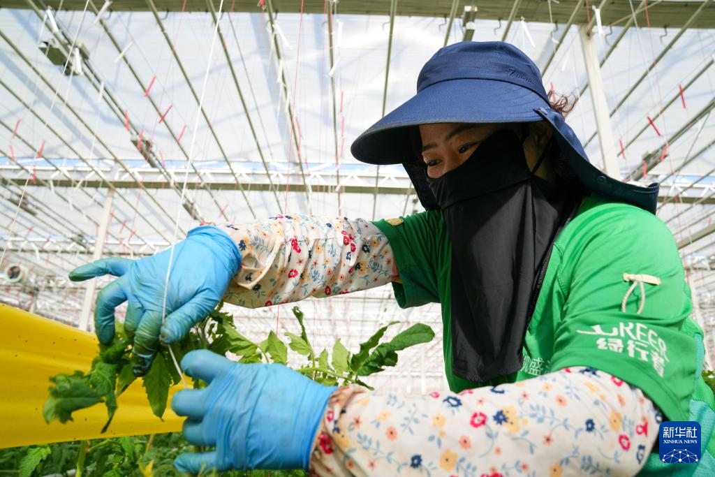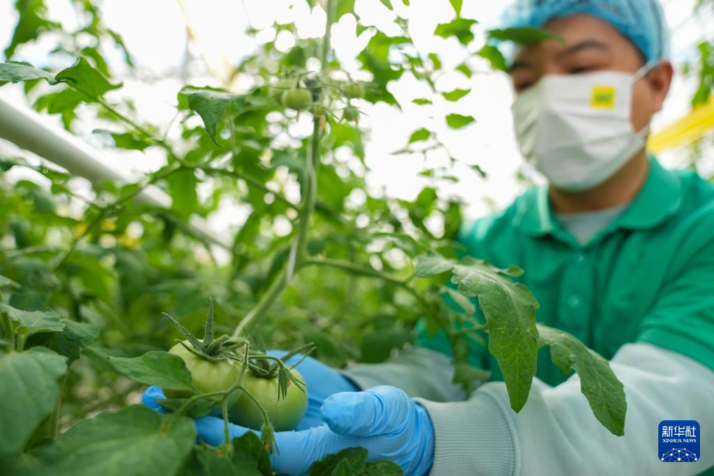 3月18日,在凯盛浩丰(佳木斯)智慧农业产业园的智能温室内,工作人员给番茄秧盘头。