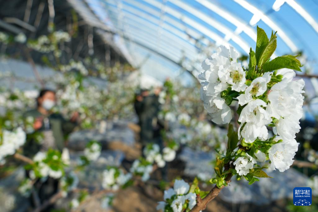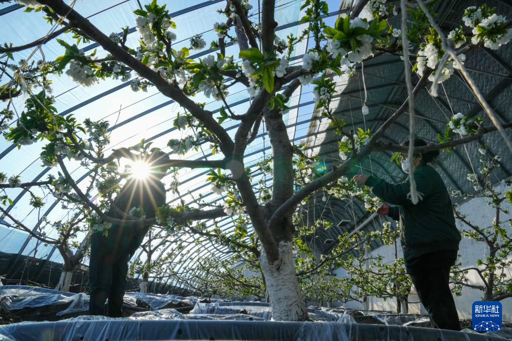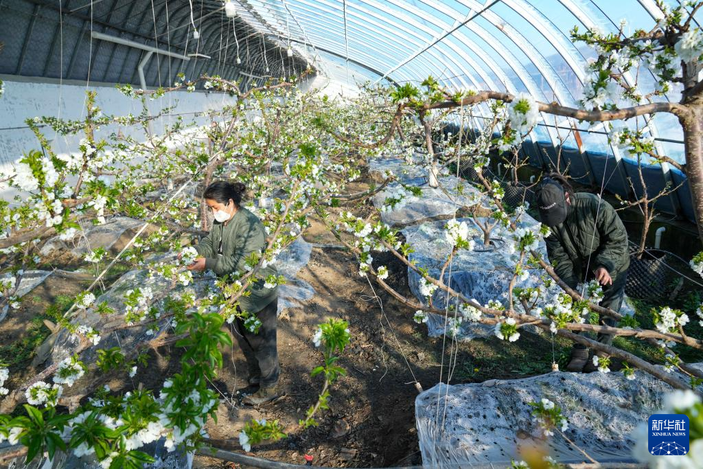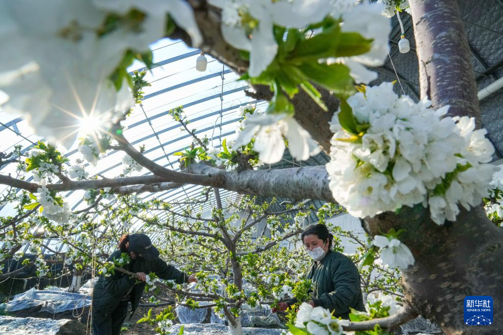3月18日,在黑龙江省佳木斯市郊区现代农业产业园区温室内,工作人员给樱桃树疏花。